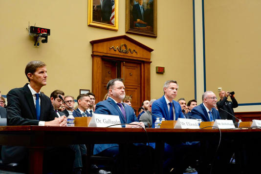 [2] Des témoins témoignent devant des membres du Congrès lors d'une audience sur les phénomènes anormaux non identifiés (UAP) le 13 novembre 2024 au Capitole à Washington, D.C. De gauche à droite : le contre-amiral à la retraite de la marine Tim Galludet, l'ancien fonctionnaire du ministère de la Défense Luis Elizondo, le journaliste indépendant Michael Shellenberger et Michael Gold, ancien administrateur associé de la politique spatiale de la NASA et membre de l'équipe d'étude indépendante de l'UAP. (Crédit : Bryce Hoye/CBC)